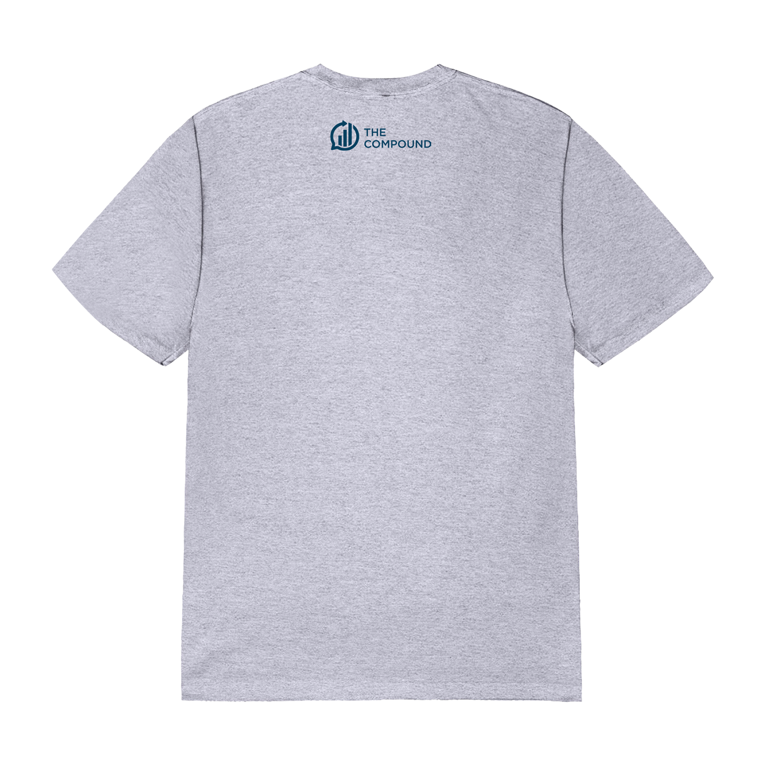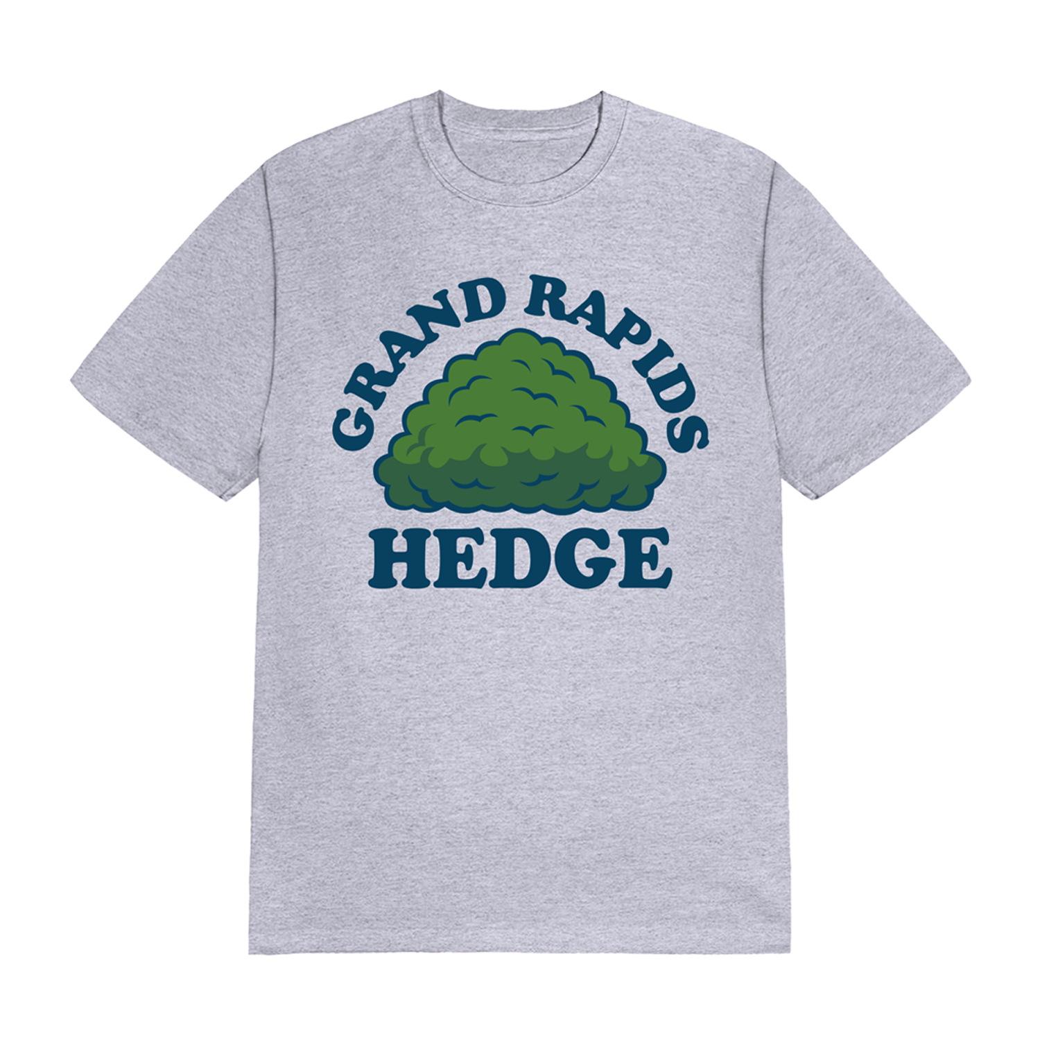 The Compound Shop Official Merchandise. Gray 100% cotton t-shirt unisex style with a classic retail fit featuring a design with the text "GRAND RAPIDS" arched above a green, bushy hedge illustration.